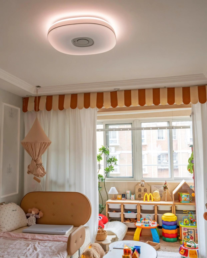A5:不建议让婴儿长时间直视吸顶灯,即使光源经过优化,婴儿的视觉系统仍属高度敏感期。新生儿与婴幼儿阶段,视觉皮层尚在发育,其晶状体透明度高、黄斑区未成熟,尤其容易受到高亮度直射与短波蓝光刺激影响。即便是眩光控制较好的产品,也不应作为“可直视光源”长期存在于婴儿注视视野中。