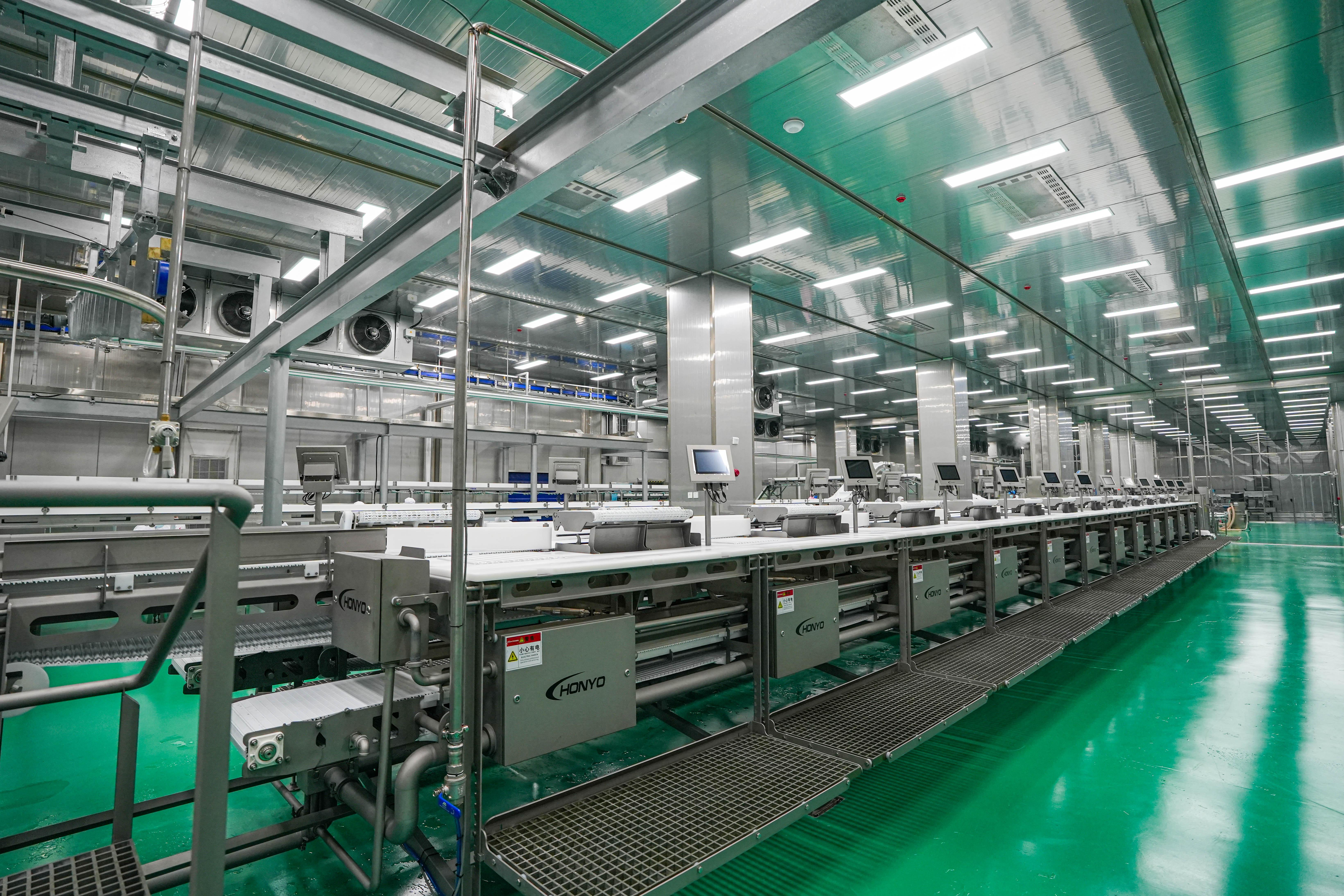 白色输送带欢快传动,绿色指示灯不时闪烁,显示屏上数值即时更新……科技感和现代感十足。换上洁净工作服,踏入十万级净化车间,眼前景象更似高科技实验室,而非传统肉类加工厂。