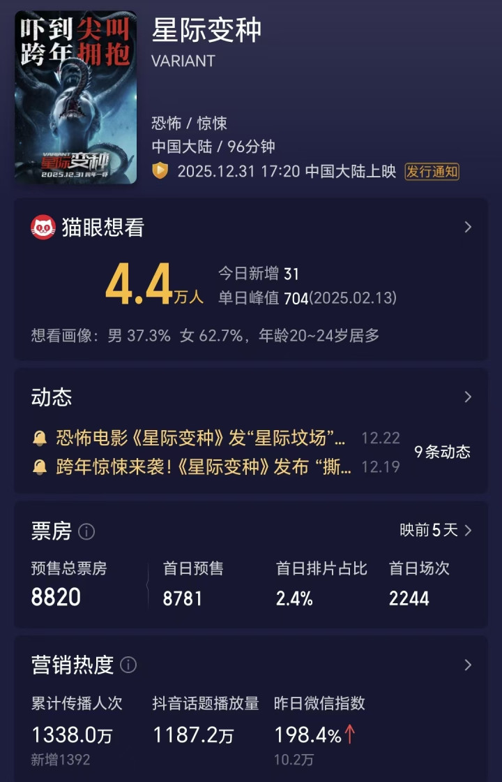 《星际变种》被指“抄袭”经典《异形》,预售票房仅8000多元人民币,被古天乐新片碾压。
